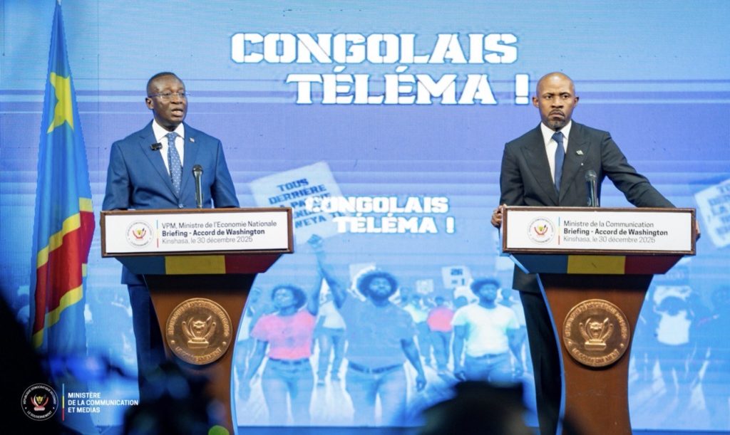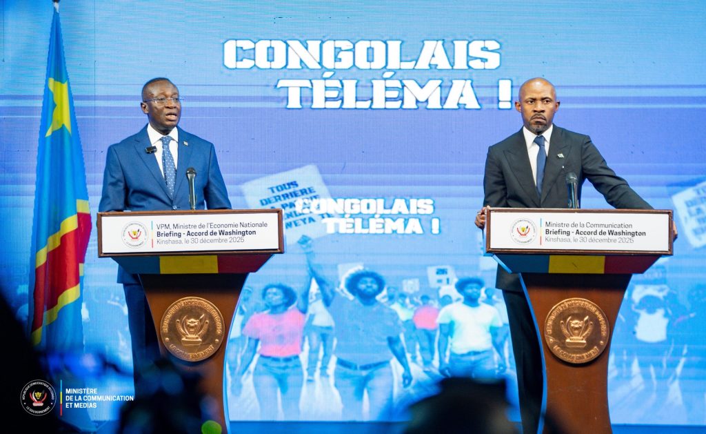 Cinq mois après la signature de l’accord de paix entre la République démocratique du Congo et le Rwanda à Washington, le Gouvernement congolais est revenu, mardi 30 décembre 2025 à Kinshasa, sur le contenu et les mécanismes de l’« Accord de Washington » liant la RDC aux États-Unis. Lors d’un briefing spécial animé au studio Maman Angebi de la RTNC, le vice-Premier Ministre en charge de l’Économie nationale, Daniel Mukoko Samba, et le Ministre de la Communication et Médias, Patrick Muyaya Katembwe, ont apporté des éclaircissements détaillés pour dissiper les controverses et rassurer l’opinion publique.