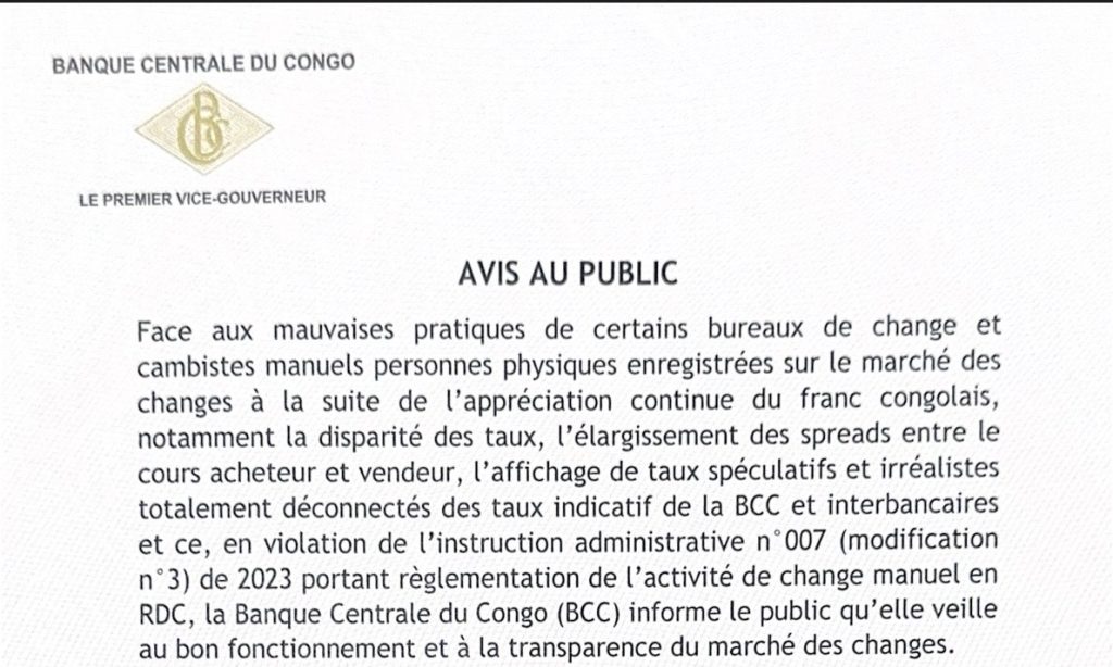 Face aux mauvaises pratiques observées sur le marché des changes dans le contexte actuel d’appréciation du franc congolais, la Banque Centrale du Congo (BCC) rappelle à l’ensemble des cambistes manuels l’obligation stricte de se conformer aux dispositions de l’Instruction administrative n°007 (modification n°3) de 2023 relative à la réglementation de l’activité de change manuel en RDC.