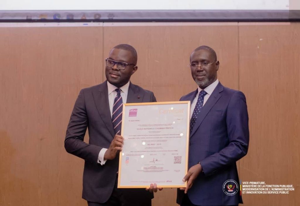 Jean-Pierre Lihau Ebua, Vice-Premier Ministre, Ministre de la Fonction publique, a présidé ce lundi 22 décembre 2025, la cérémonie officielle de remise de la certification ISO 9001:2015 du Système de management de la qualité à l’École Nationale d’Administration (ENA), certification délivrée par l’AFNOR.