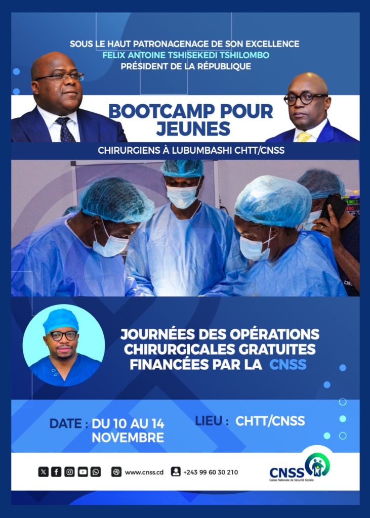 Sous le haut patronage du Président de la République, Félix-Antoine Tshisekedi Tshilombo, la Caisse Nationale de Sécurité Sociale (CNSS), dirigée par le DG Charles Mudiay, organise du 10 au 14 novembre au CHTT/CNSS de Lubumbashi des journées d’opérations chirurgicales gratuites. Une initiative à fort impact social qui traduit l’engagement de la CNSS à placer la santé et le bien-être des Congolais au cœur de sa mission.