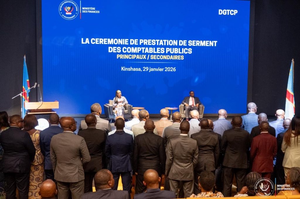 La salle P1 Budget du Centre financier de Kinshasa a accueilli, jeudi 29 janvier 2026, la cérémonie solennelle de prestation de serment des comptables publics principaux et secondaires affectés aux ministères pilotes de la déconcentration de l’ordonnancement. Cette étape s’inscrit dans les engagements du Gouvernement congolais avec le Fonds monétaire international, dans le cadre du programme de la Facilité élargie de crédit, en vue de moderniser la gestion financière de l’État.